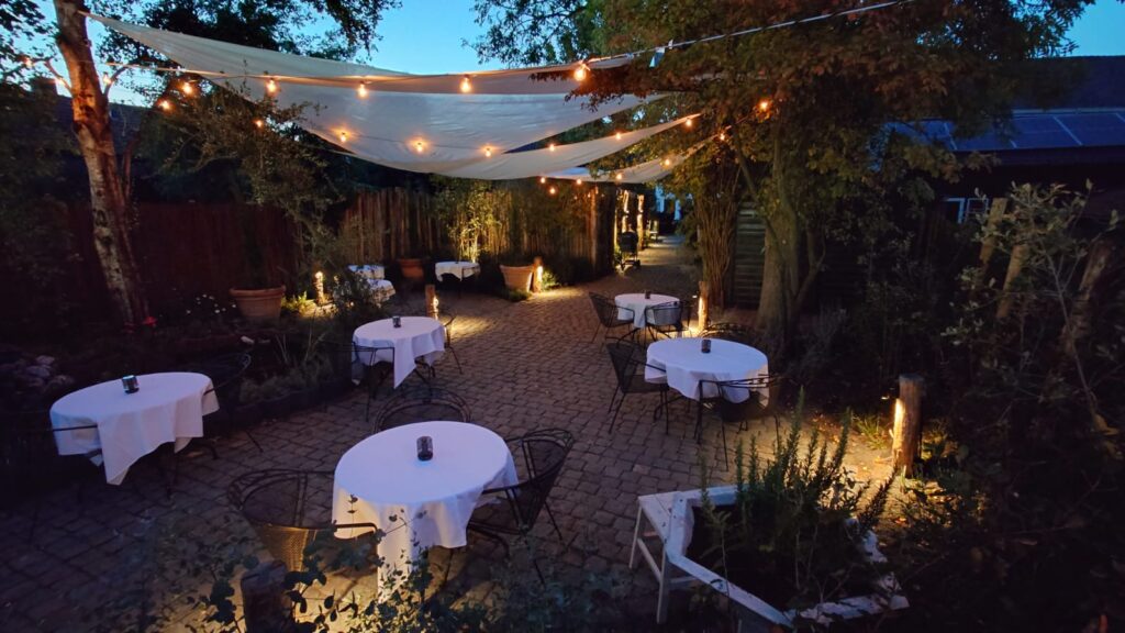 Geniet buiten in onze rustgevende terrastuin, waar de avondzon vaak tot laat blijft hangen. Of neem plaats binnen, waar het knus en levendig is – met fijne muziek en zicht op de open keuken waar het vakmanschap tot leven komt.